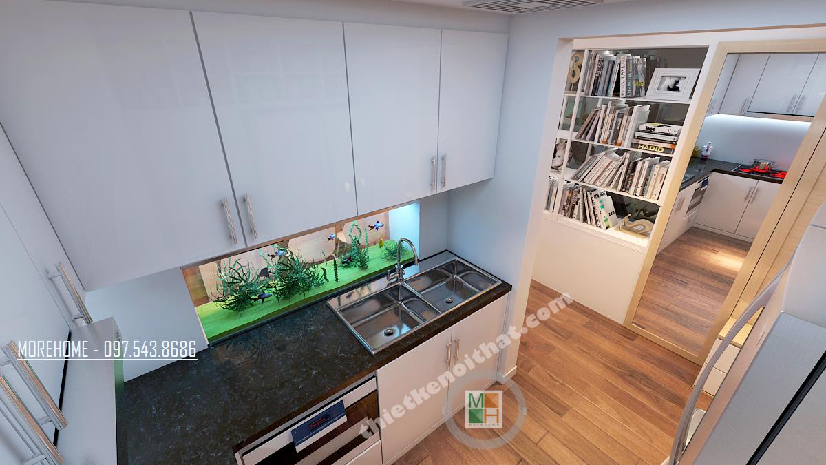 Trong không gian thiết kế này, tủ bếp được nổi bật lên bởi sự tương phản màu sắc giữa tủ bếp và bàn bếp. Bàn bếp được trang trí bằng gạch đá đen huyền bí, bếp được lắp âm gọn gàng và sạch sẽ. Không gian được nổi bật với tính gần gũi còn bởi một hệ sinh thái nhỏ xuất hiện ngay trong bếp làm cho bếp thêm sinh động và thân thiện hơn.