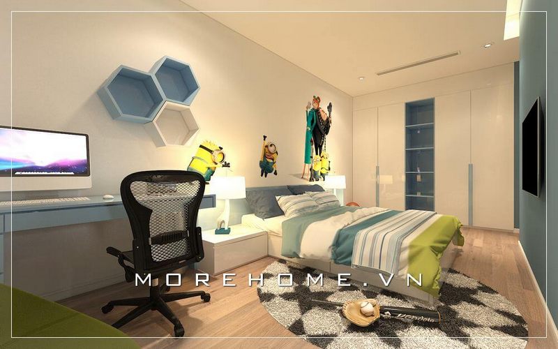 Trang trí phòng ngủ bé trai đầy ấn tượng, chiếc tủ quần áo 3 cánh hiện đại kết hợp kệ trang trí độc đáo khiến con thích thú hơn cả